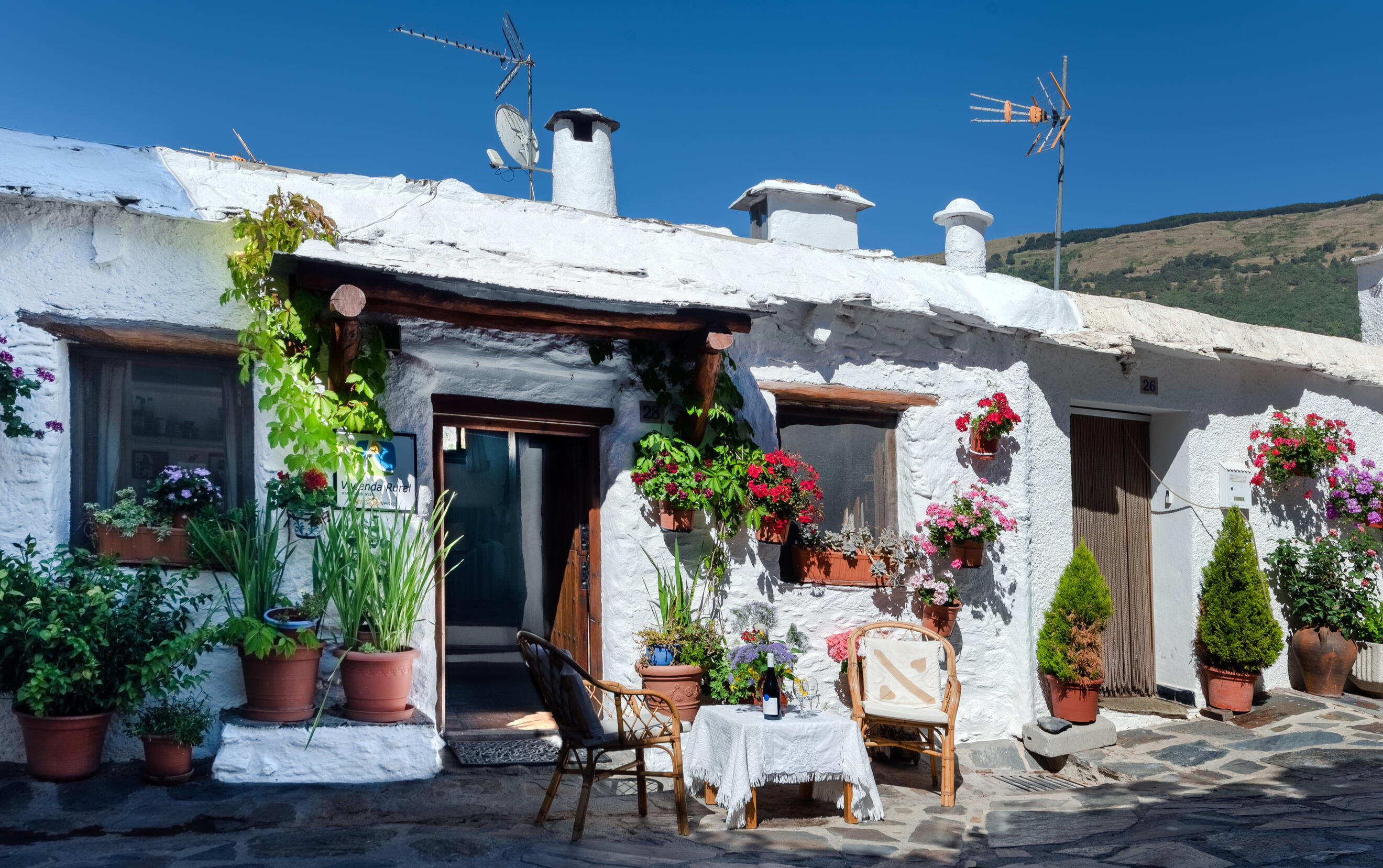 A completely restored village house with real character: thick chestnut beams, original wood features, and a lovely position just below the quiet main square.Terrace cafés and restaurants, bakeries, small supermarkets, a bank and parking are all a short stroll away, yet the street itself is traffic-free. The house sits on a calm corner where the lane widens and the village slows down.Walks start at the front door, with a path up the Poqueira Gorge and another down to the river.