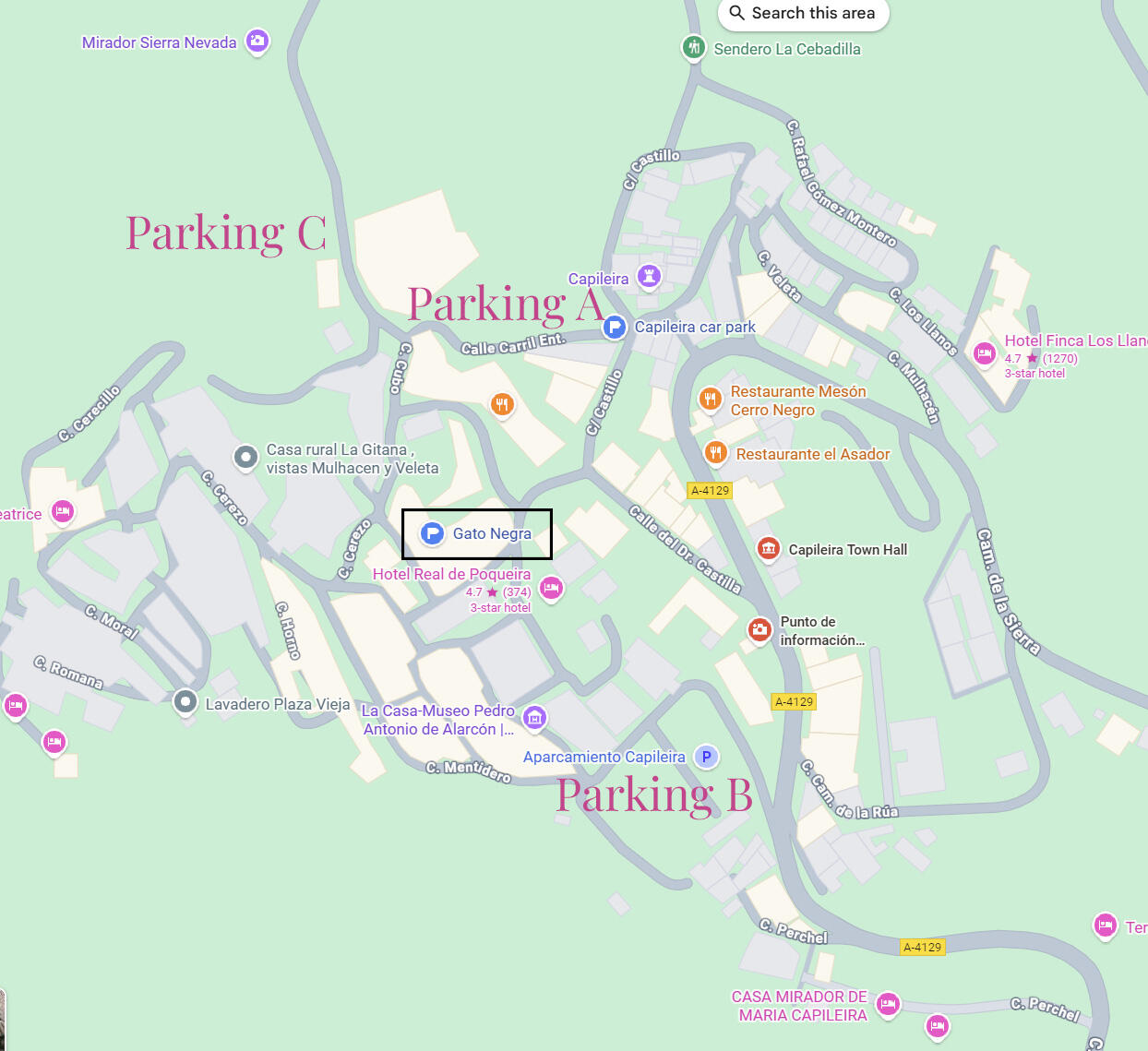 There are three public parking areas. All of them are just a few minutes walk from Gato Negro as shown on the map.